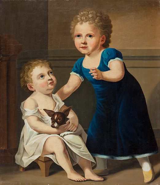 Zwei blonde Kinder mit kl. geflecktem Hund