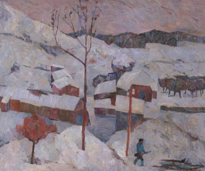 Winters dorpsgezicht in de bergen, op de voorgrond een jager