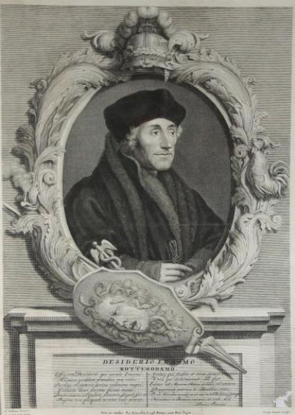 Portrait d'Erasme dans un décor de feuilles d'acanthes et d'attributs