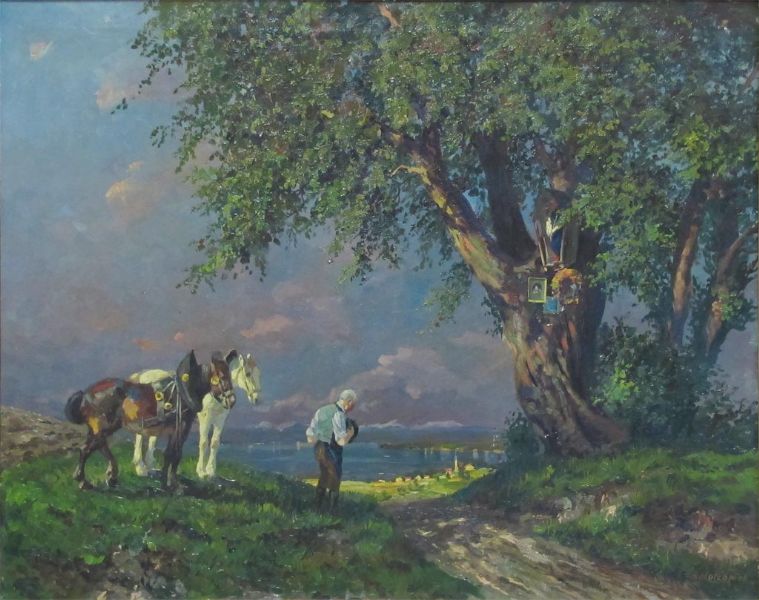 Im Hintergrund Kirchdorf an einem See und Alpen