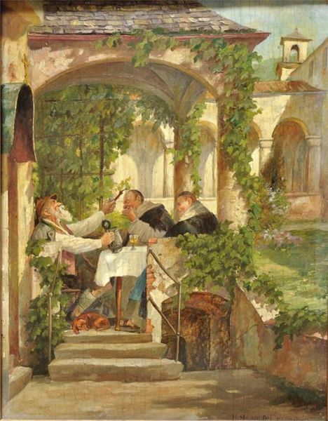 | Sommerliche Ansicht des Innenhofes einer Klosteranlage mit zechendem Bärtigen und zwei Mönchen. | |