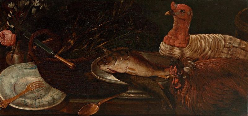 Stilleben mit Geflügel, Fisch, Besteck und Fayenceplatte.