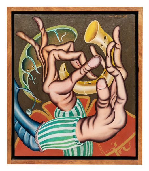| Zwei Hände mit einer kleinen Trompete spielend (two hands playing a small trumpet) | |