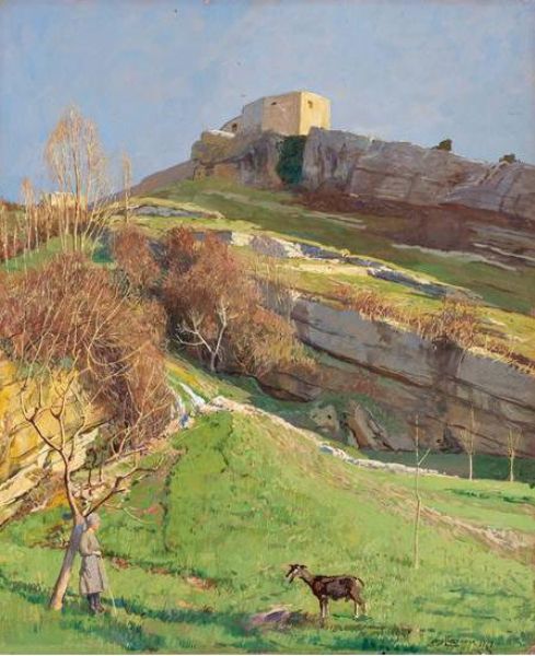 | Landschaft um den Gardasee an einem Sonnentag, im Vordergrund Hirtin mit Ziege. | |