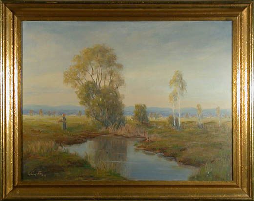 | Blick auf einen Weiher in der baumbestandenen Ebene, am Ufer eine Frau mit einem Ährenbündel unter dem Arm | |
