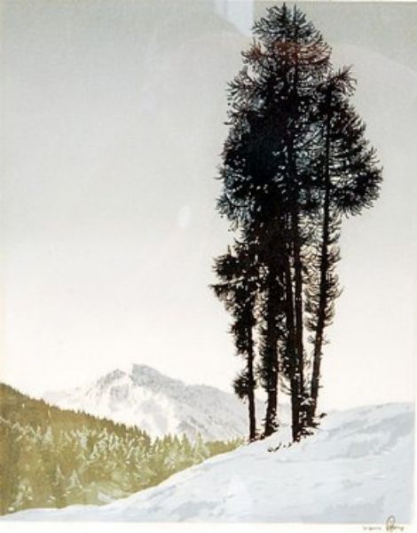 A woodblock print of fir trees in the snow against a mountain backdrop