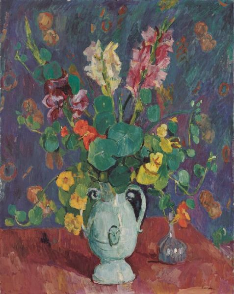 „GLADIOLEN UND KRESSE IN MASKENVASE“. 1915