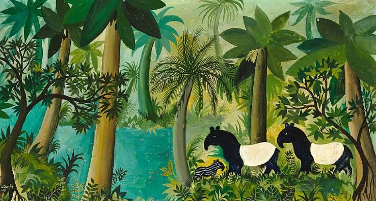 Tapirpar med unge ved skovsø