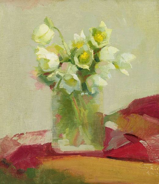 Christrosenstrauß in Glasvase, sonnig beleuchtet