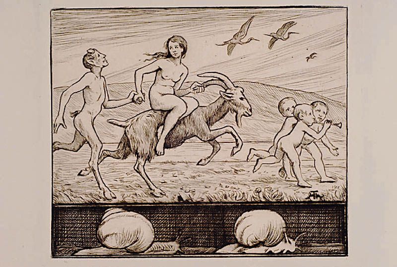 | mythologische Darstellung mit nackter Reiterin auf einem Ziegenbock, einem Faun | |