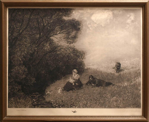 | Wiese neben einem baumgesäumten Bach, im Vordergrund lagert eine Familie mit Säugling, dahinter ihr Esel | |