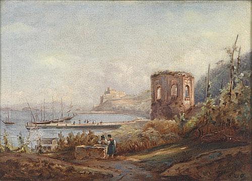 Blick auf die Mole eines südlichen Städtchens, im Vordergrund Landleute am Brunnen