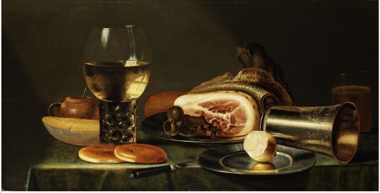 STILLEBEN MIT SCHINKEN, ZITRONE UND WEINGLAS