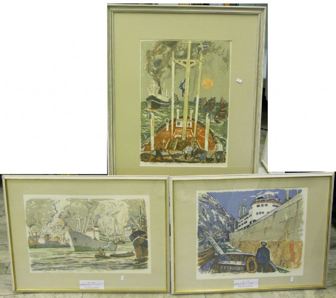 | Parti med tre olika sjömotiv med sjömän och fartyg. | |