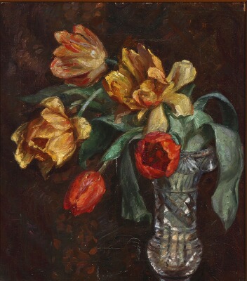 Still life with tulips in a crystal vase