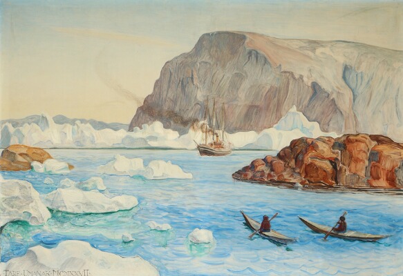 | View from Greenland with Danish steamer and two Inuits in their kayaks | |