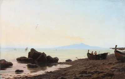 Italian family on the beach with Mount Vesuvius in the distance. Signed and dated H. Schumacher 78. Oil on canvas. 33×51 cm. | |
