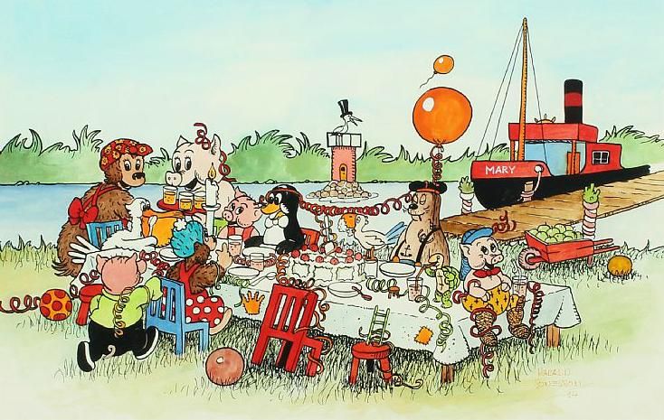 | Bruin and friends at a table, in the background the ship "Mary" | |