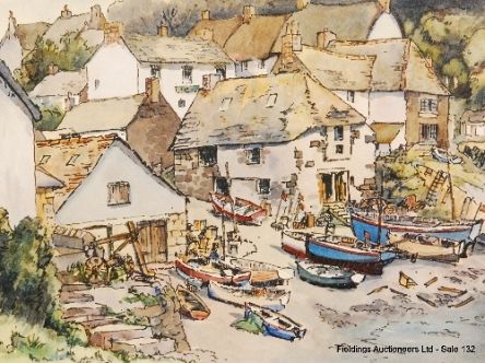 rural harbour scene with cottages and fishing boats