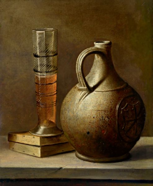 Still life with a stone jug and a beer glass