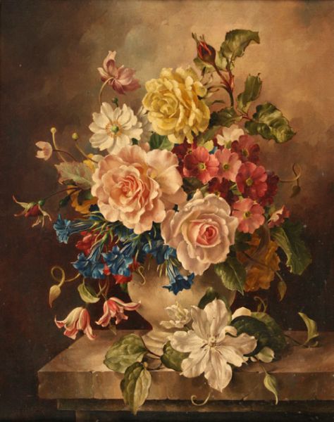 | Still Life Study of Roses, Primulas, Gentians and Japanese Anemones in a Bowl beside a Stem of Clematis on a Stone Ledge | |