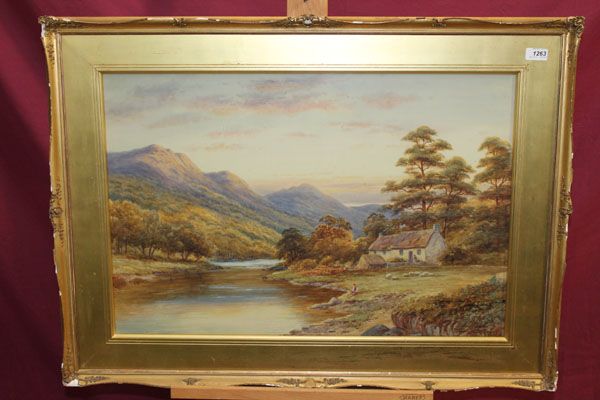 | extensive river view with a fisherman before a cottage with grazing sheep | |