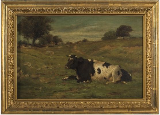 BLACK AND WHITE COW RECLINING IN A PASTURE