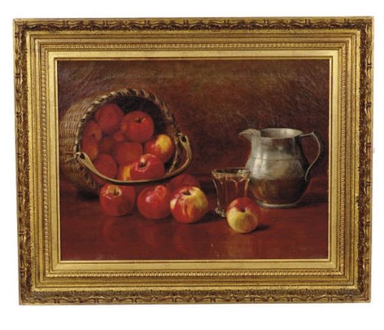 | Still life of a basket of apples with a pitcher and glass on a table | |