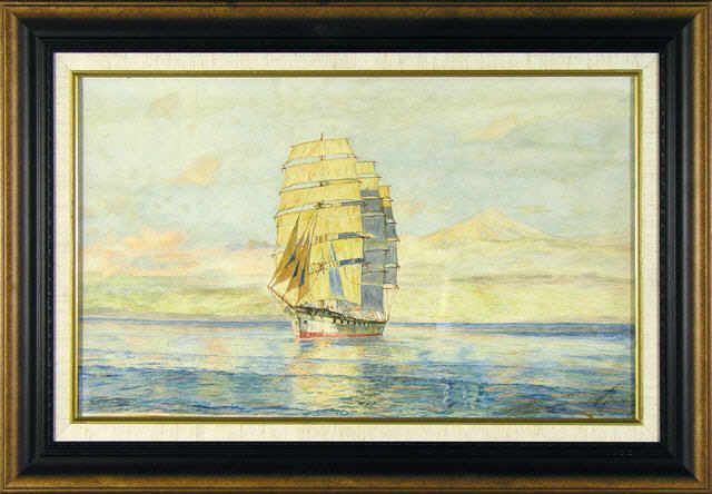 UNTITLED; TALL SHIP WITH COASTAL MOUNTAINS IN BACKGROUND