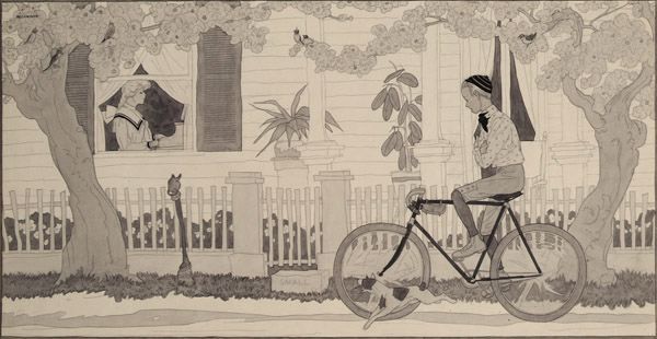 Boy bicycling past girl's window