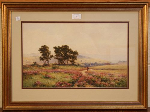| Landscape with a Figure walking through Heather on a Path towards a Cottage and the Coast | |