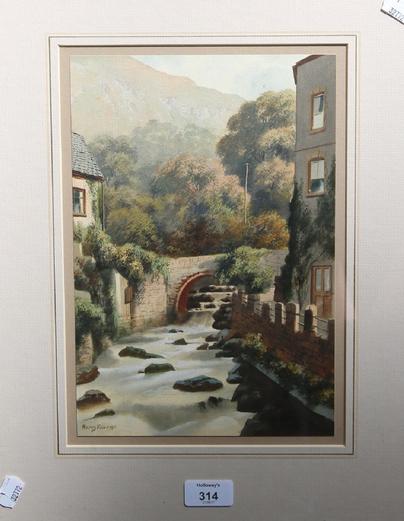 | A fast flowing river beneath stone bridge, with dwellings either side and mountains beyond | |