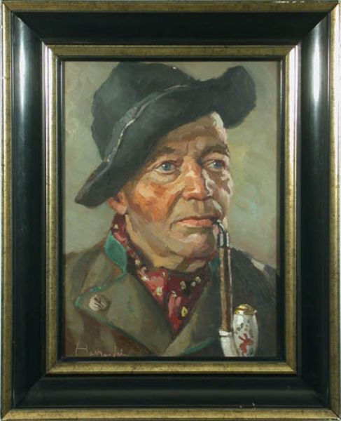 Brustbild eines Pfeife rauchenden Bauers mit Halstuch und Filzhut