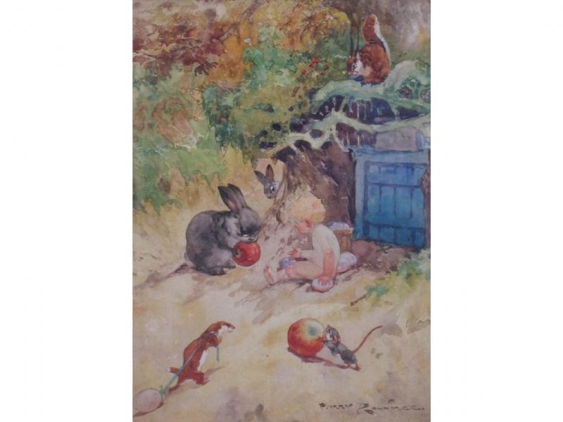 | A rabbit eating an apple surrounded by animated squirrels and ferrets | |