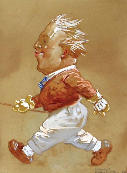 | Golfer, a stocky caricature figure, probably a portrait, striding to the left | |