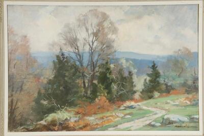 "Spring on Cotton Hill", oil on canvas, signed lower right, titled verso, in fatigued grey frame with cream liner, OS: 27 1/2" x 37 1/2", SS: 19 3/4" x 20 3/4". Fine condition. | |