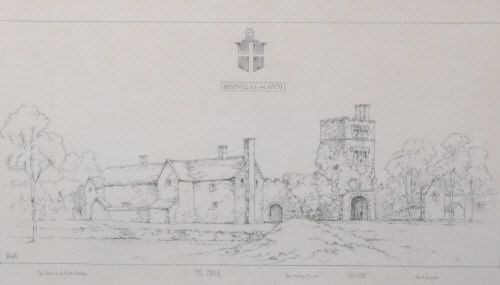 | Rushall as in 1701, showing The Moat and Outer Bailey, The Hall, The Saxon Mound, The Keep and The Chapel | |