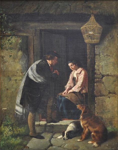 Jäger und Mädchen, mit ihren beiden Hunden am Eingang eines Bauerngehöfts.