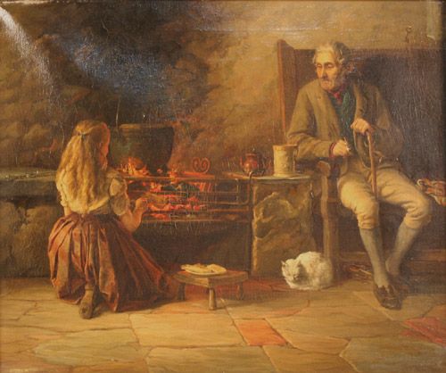 | Cottage Interior with an Elderly Gentleman Seated by an Open Fire with Cat at his Feet, nearby a Young Girl preparing Food | |