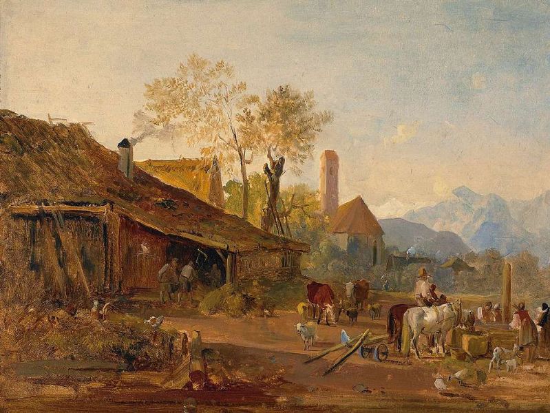 | Nachlaßstempel. Kirchdorf mit regem ländlichem Leben; Tiere am Brunnen mit zahlreichen Personen, dreschende Bauern | |