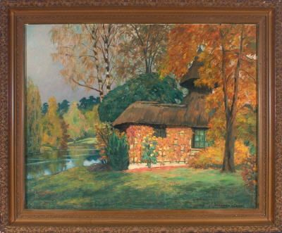 | Blick auf ein von Bäumen gesäumtes, reetgedecktes Fachwerkhaus mit Turm am Flussufer in herbstlicher Parklandschaft | |