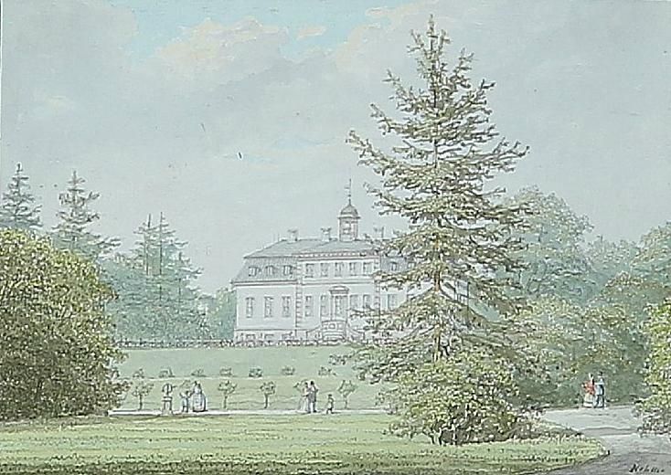 | View of Sorgenfri Castle with figures walking in the park. | |