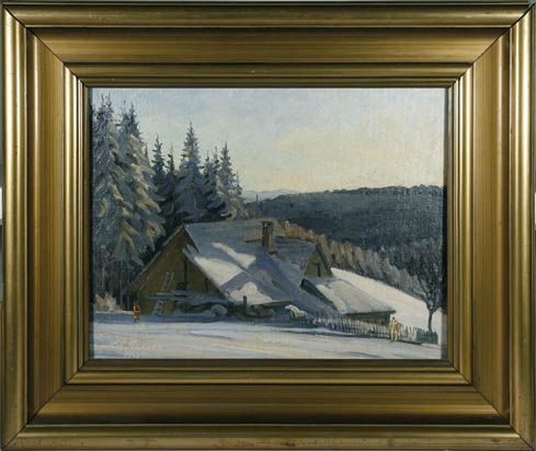 | Winterliche Schwarzwaldlandschaft. Im Vordergrund ein Bauerngehöft am Rand des Tannenwaldes, im Hintergrund die Höhenzüge unter | |