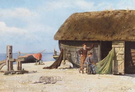 Fischerfamilie am Strand; junge Frau flickt Netz