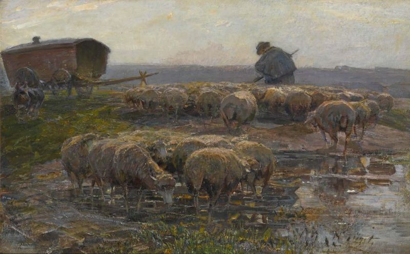 Schafherde am Tümpel mit Schäfer und Schäferkarren
