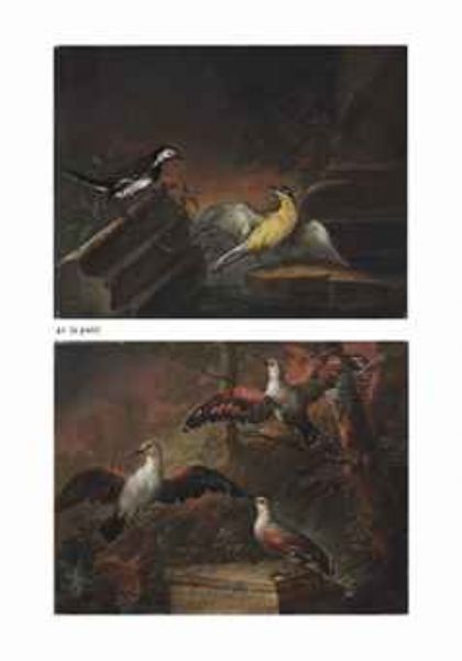 | A pied wagtail and a grey wagtail by classical ruins on a forest floor; and Three wallcreepers by classical ruins on a forest fl | |
