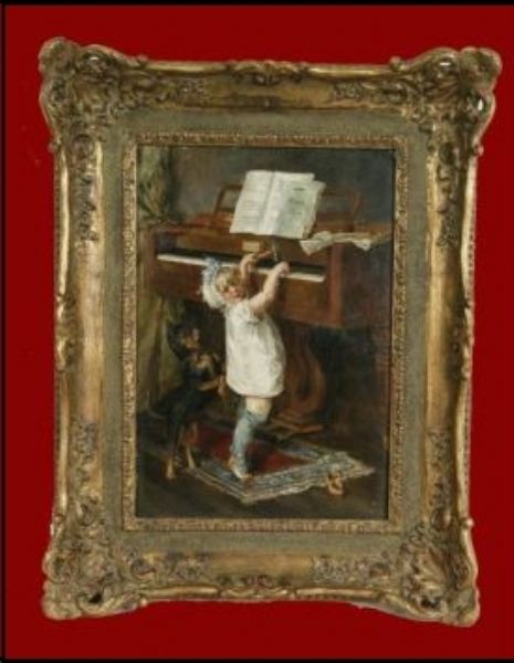 Kleines Mädchen mit Hammer und Hund am Klavier