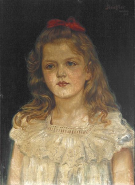 Schulterporträt eines jungen Mädchens mit roter Haarschleife