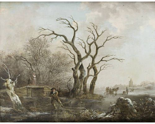 A winter landscape with a man walking his dog beside a frozen river with skaters and a windmill beyond; and A winter landscape w