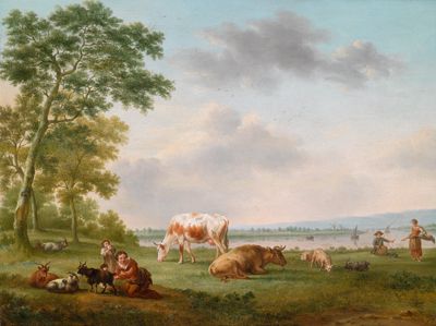 | Two sunlit landscapes with shepherds and their flocks near a river/a well outside a cottage | |